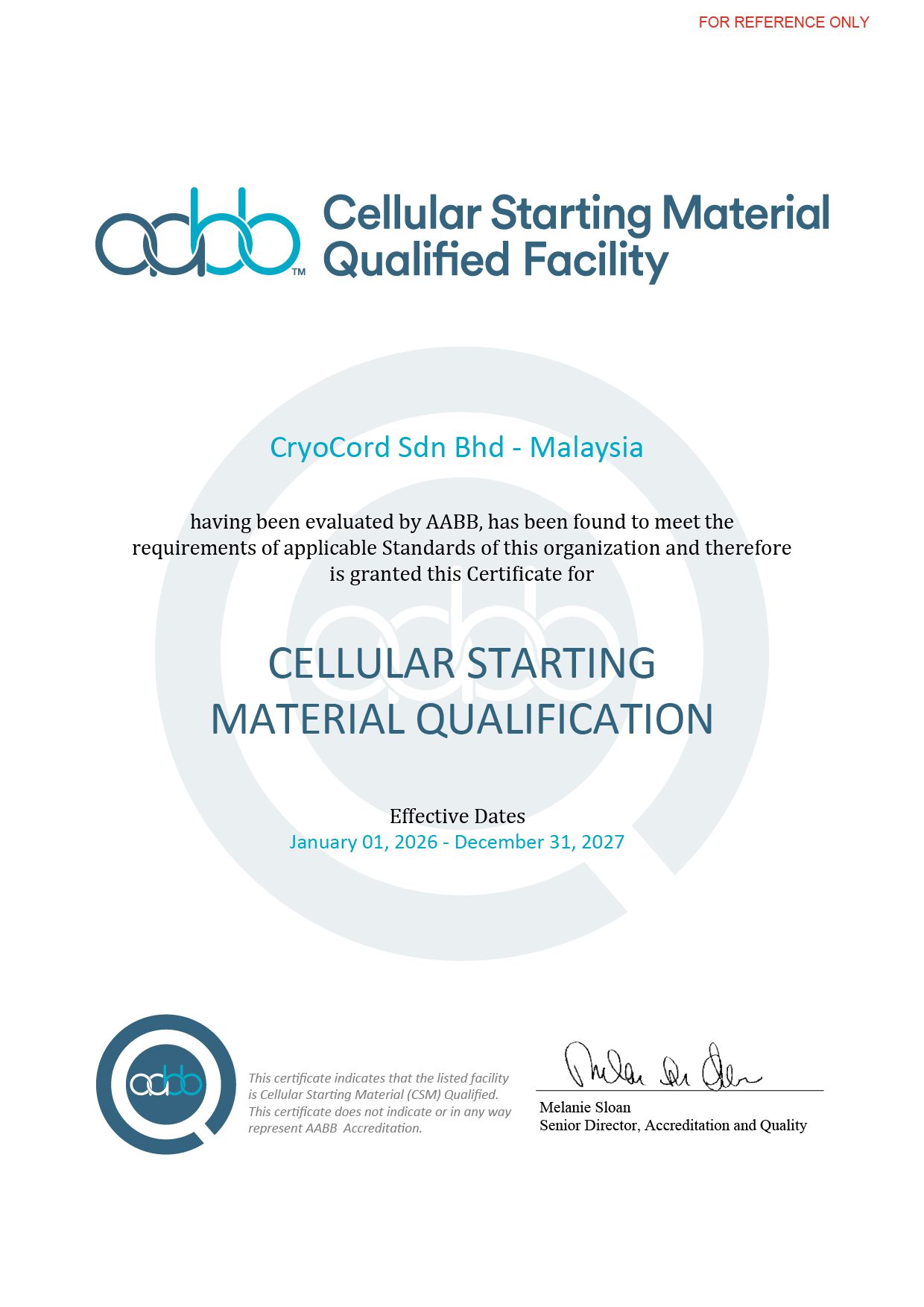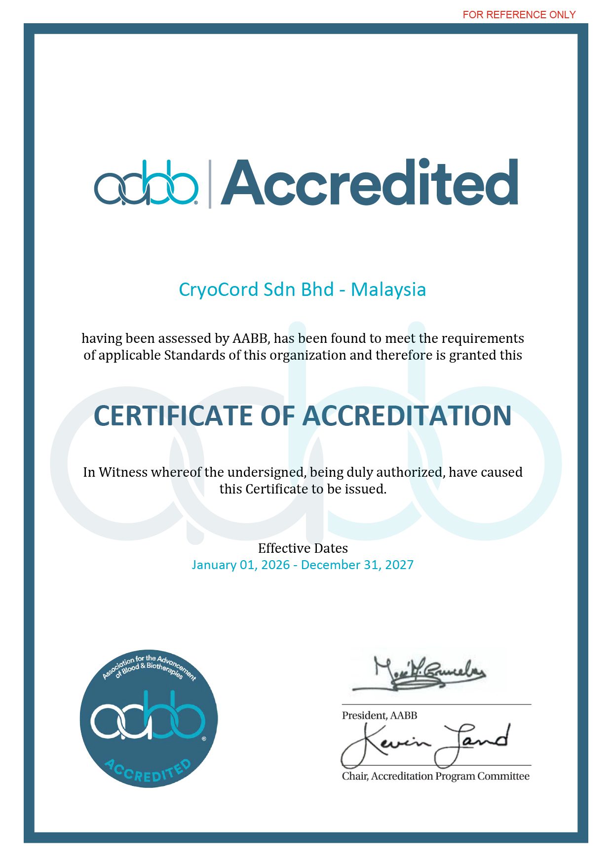 Sejak 2020 terakreditasi AABB; the global gold standard–suatu badan yang mengkaji keunggulan mutu terapi dan transfusi seluler, sertifikasi dikeluarkan setelah melalui proses kajian on-site yang ketat demi membuktikan keunggulan kami baik dari aspek teknis, medis maupun administratif.