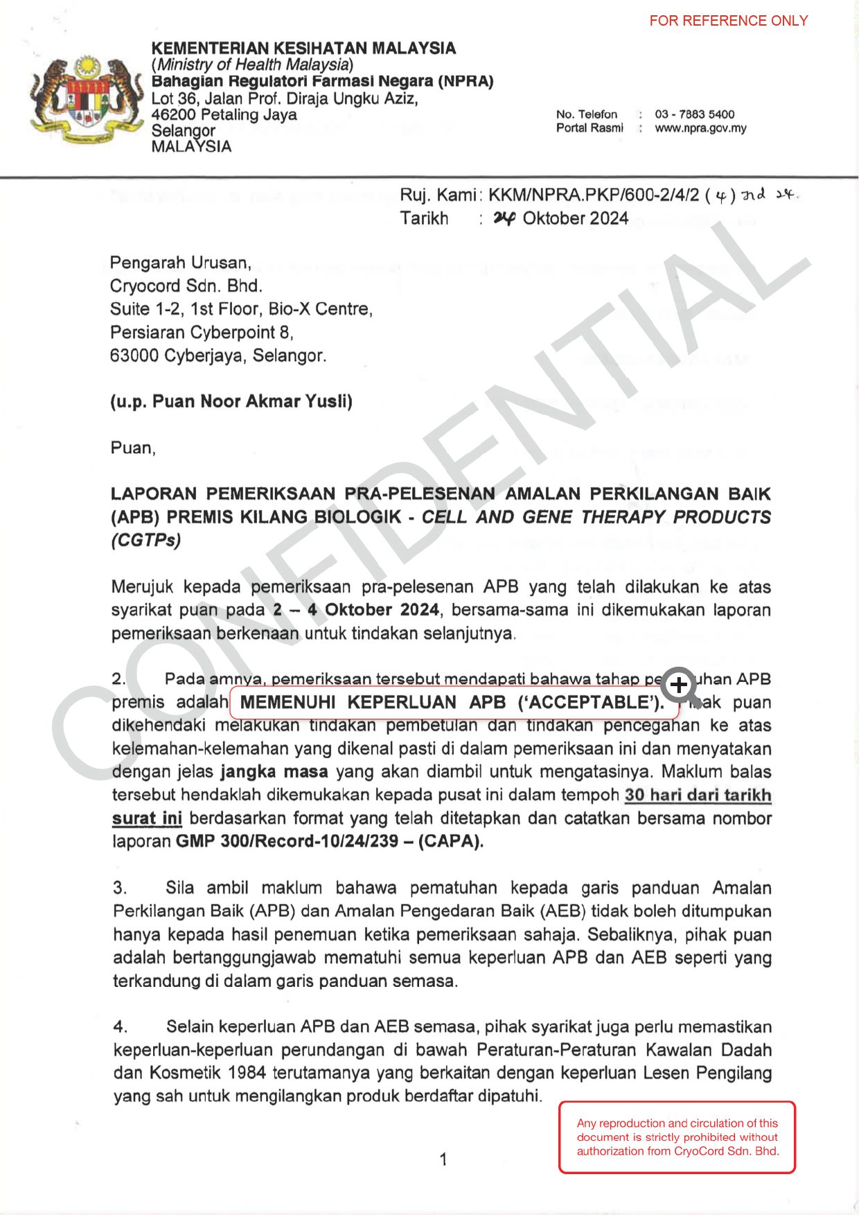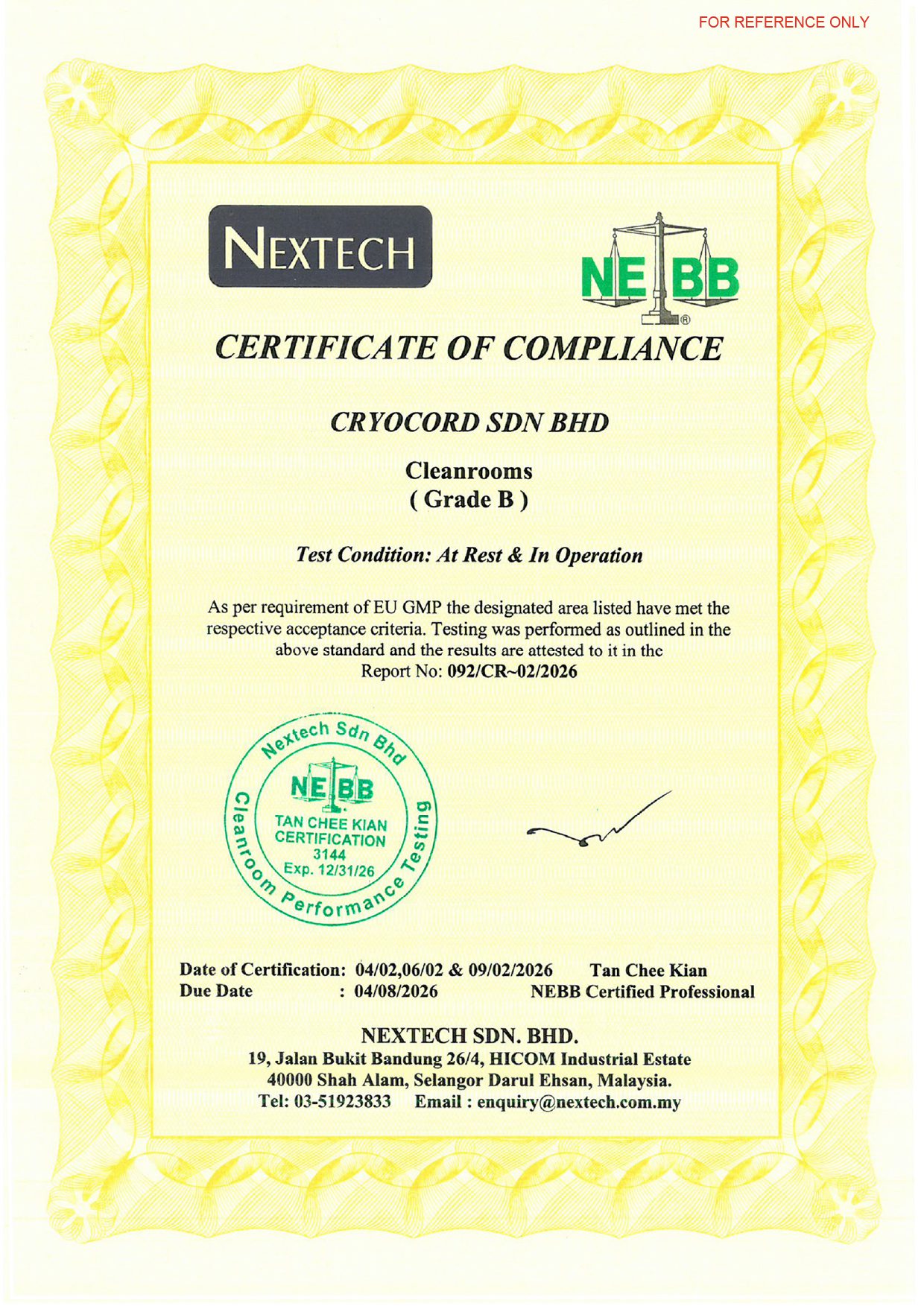 Laboratorium CryoCord memperoleh sertifikasi cGMP karena memenuhi standard yang ditetapkan oleh Pharmaceutical Inspection Co-operation Scheme (PIC/S), oleh National Pharmaceutical Regulatory Agency (NPRA) Malaysia pada tahun 2013. Sertifikasi ini merupakan jaminan atas konsistensi, keamanan, dan kualitas pemrosesan sel punca melalui penerapan pengawasan fasilitas yang ketat, protokol operasional yang terstandar, serta sistem pengawasan mutu secara menyeluruh.