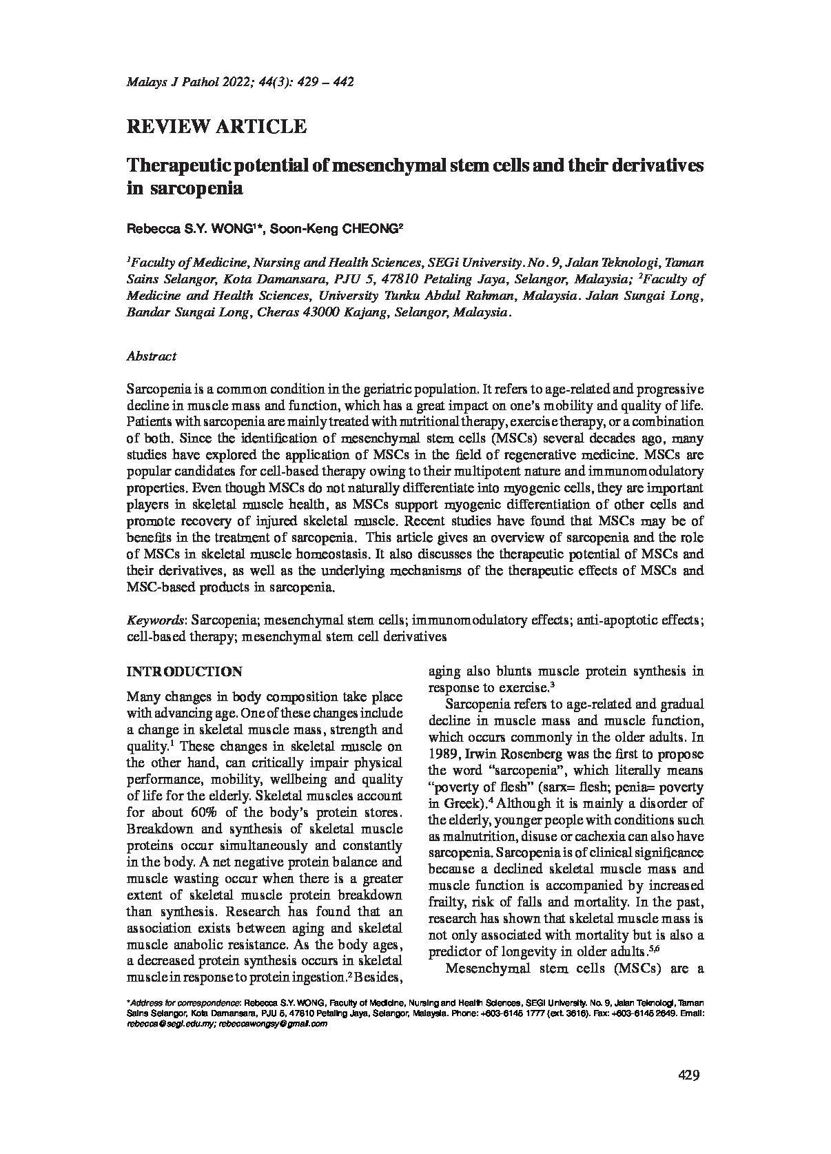 Therapeutic Potential of Mesenchymal Stem Cells and Their Derivatives in Sarcopenia