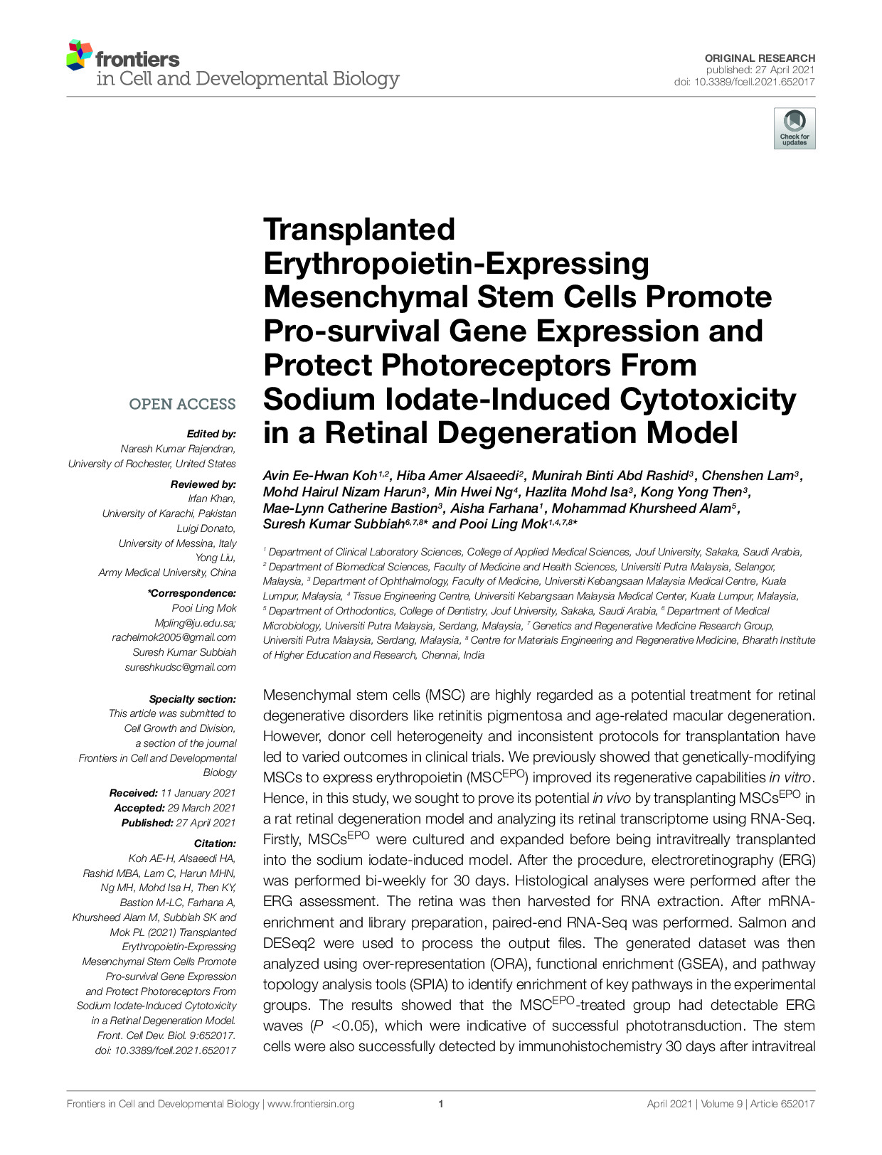 Transplanted Erythropoietin-Expressing Mesenchymal Stem Cells Promote Pro-survival Gene Expression and Protect Photoreceptors From Sodium Iodate-Induced Cytotoxicity in a Retinal