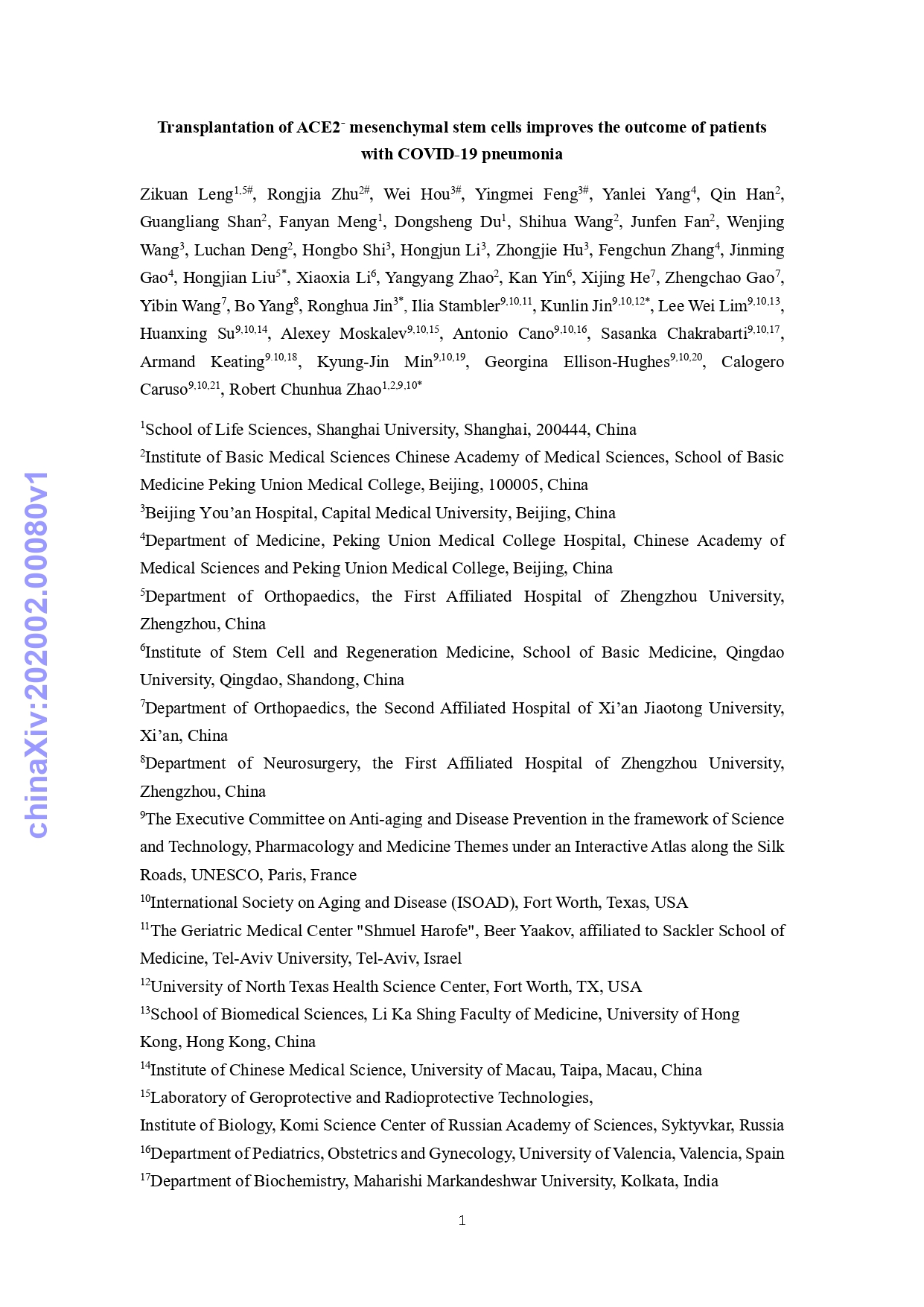 Transplantation of ACE2 Mesenchymal
